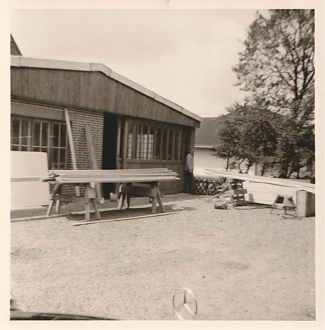 Manfred Jensens erste Werkstatt — eine kleine Garage in Alkersum. Hier begann 1961 die Geschichte der Tischlerei M. Jensen.